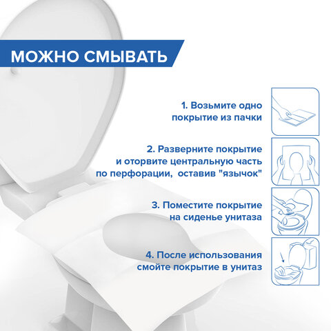 Одноразовые защитные покрытия на унитаз предназначены для создания надежной индивидуальной защиты от грязи и микробов при посещении туалетных комнат в общественных местах (торговых центрах, ресторанах, медицинских учреждениях, офисах и т.п.), а также во время путешествий (в аэропортах, отелях и на вокзалах). Изготовлены из специальных сортов бумаги без химических примесей. Не засоряют канализацию, растворяясь в воде как туалетная бумага. Благодаря специальной форме (центральная часть покрытия свешивается в унитаз) покрытие подхватывается водой при смывании, при этом руками трогать его не требуется. Покрытия сертифицированы и безопасны в использовании. Универсальная форма и размер предполагают использования на любых типах унитазов.