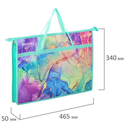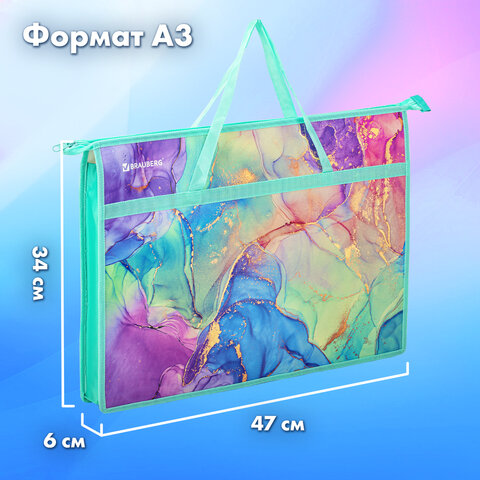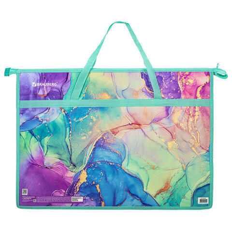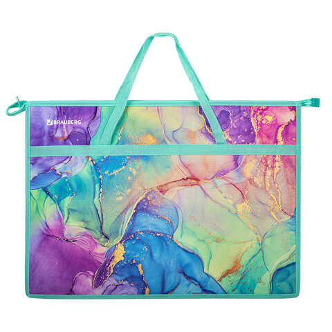 Папка BRAUBERG формата А3 предназначена для хранения чертежей, рисунков и других художественных изображений. Выполнена из пластика, по краям имеет тканевую окантовку. Одно отделение. Застежка-молния расположена по верхнему краю папки. Цветная печать.