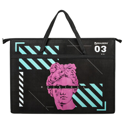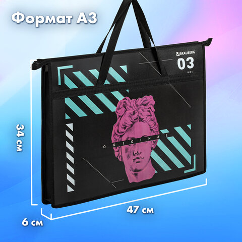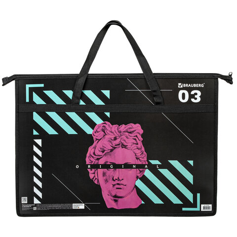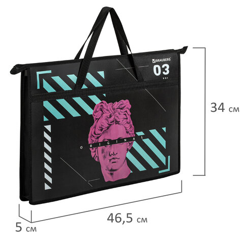 Папка BRAUBERG формата А3 предназначена для хранения чертежей, рисунков и других художественных изображений. Выполнена из пластика, по краям имеет тканевую окантовку. Одно отделение. Застежка-молния расположена по верхнему краю папки. Цветная печать.