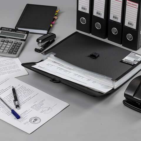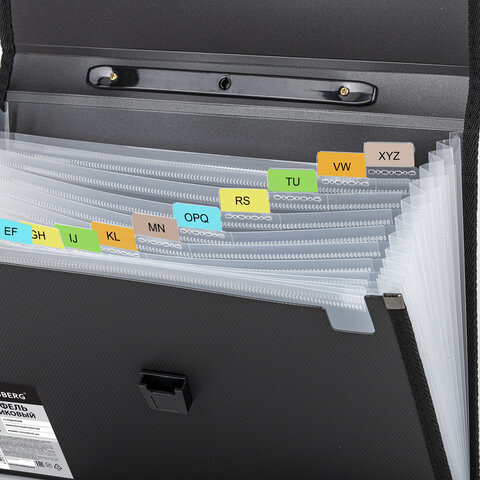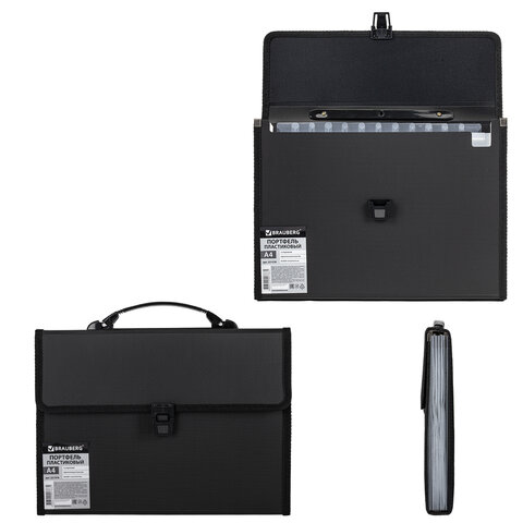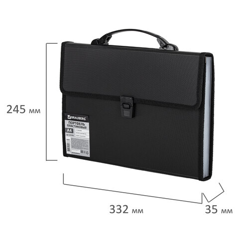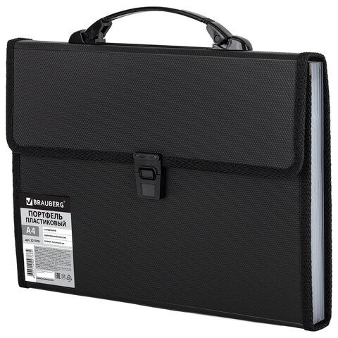 Портфель формата А4 (332х245х35 мм) изготовлен из плотного пластика толщиной 1 мм, выполнен в солидном черном цвете с фактурой "циновка" и имеет 13 отделений с индексными ярлыками. Складная ручка обеспечивает компактность изделия. Портфель застегивается на клапан. Края окантованы тканью с металлическими рейками по краям окантовки, что придает изделию презентабельный вид.
