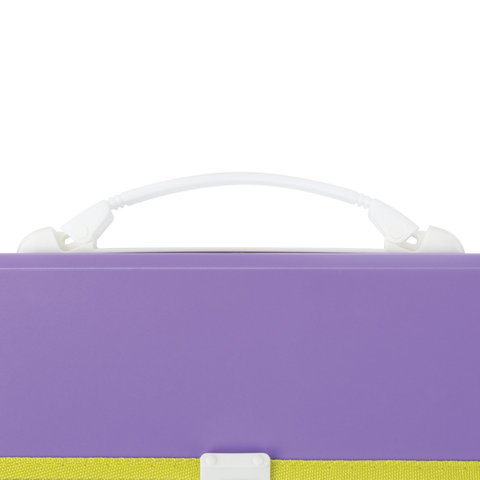 Портфель формата А4 (330х245х35 мм) изготовлен из плотного пластика стандартной фактуры толщиной 0,7 мм, выполнен в ярком фиолетовом цвете и имеет 13 отделений с индексными ярлыками. Складная ручка обеспечивает компактность изделия. Портфель застегивается на клапан. Края окантованы тканью с металлическими рейками по краям окантовки, что придает изделию презентабельный вид.