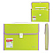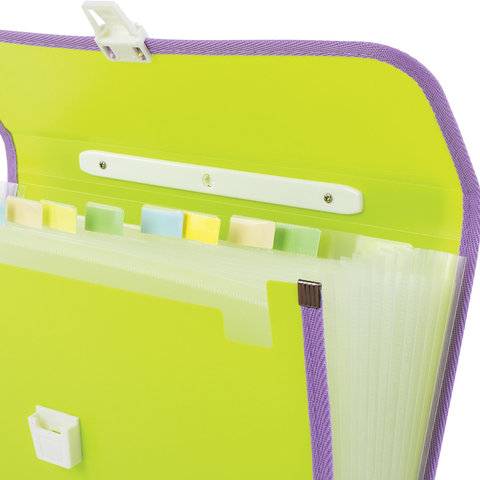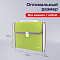 Портфель формата А4 (330х245х35 мм) изготовлен из плотного пластика стандартной фактуры толщиной 0,7 мм, выполнен в ярком салатовом цвете и имеет 13 отделений с индексными ярлыками. Складная ручка обеспечивает компактность изделия. Портфель застегивается на клапан. Края окантованы тканью с металлическими рейками по краям окантовки, что придает изделию презентабельный вид.