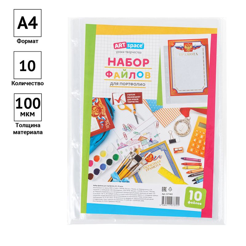 Набор прозрачных файлов-вкладышей А4 ArtSpace для портфолио школьника формата А4 размера 310*215 мм для папки-портфолио для школьников, как дополнительные файлы для хранения фотографий, грамот, дипломов и т.д. и т.п. Толщина плёнки 100 мкм. В упаковке 10 штук.