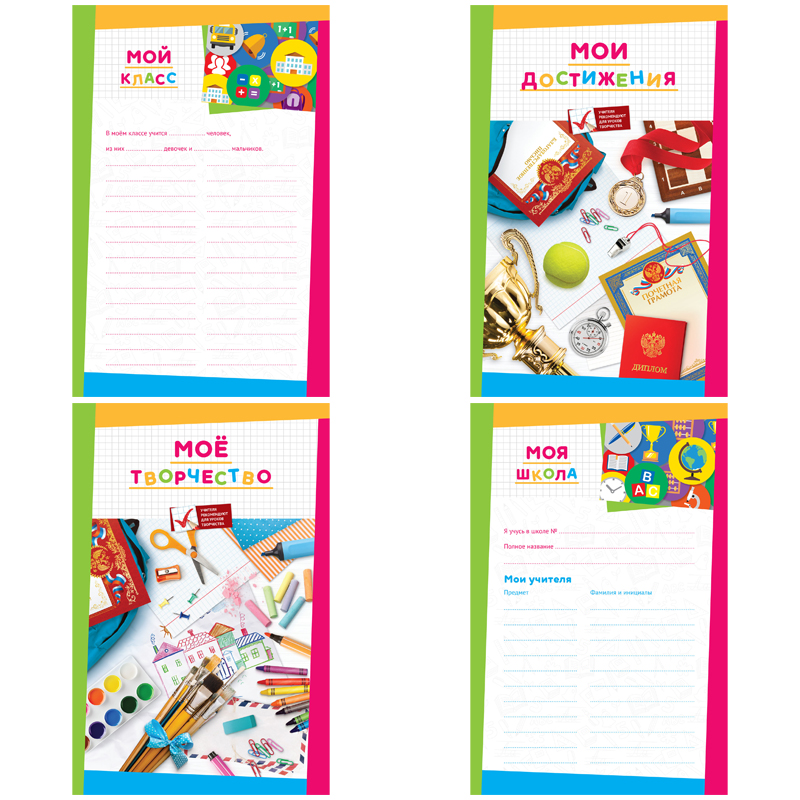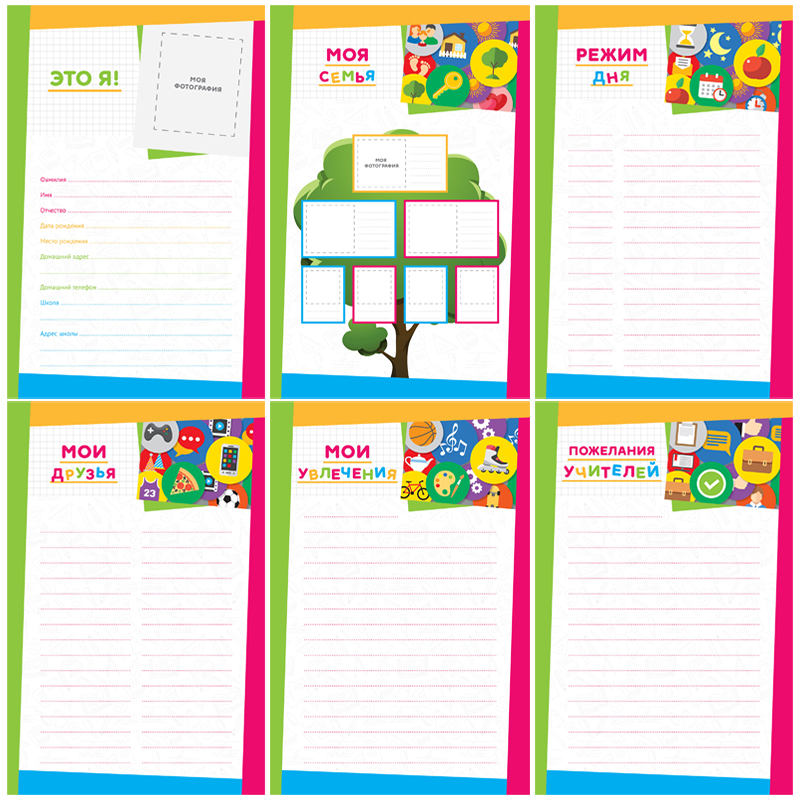 Набор вкладышей 10 листов для портфолио школьника с разделами: "Это я!", "Моя семья", "Режим дня", "Мои друзья", "Мои увлечения", "Моя школа", "Мой класс", "Пожелания учителей", "Мои достижения" и "Мое творчество".