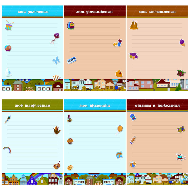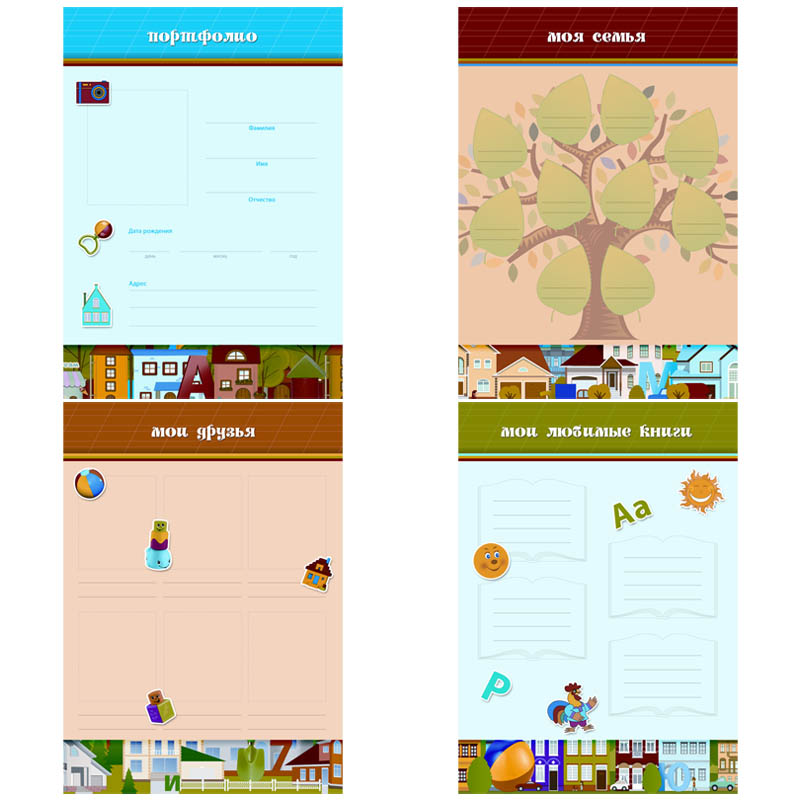 Для родителей дошкольников готовые шаблоны портфолио станут «палочкой-выручалочкой», поскольку избавят от необходимости оформлять всё «с нуля». Портфолио пригодится педагогам, родителям и детям, которые готовятся стать первоклассниками. В портфолио вы можете вложить грамоты, лучшие рисунки, странички из тетрадей или копии с самыми удачными и аккуратными работами. Это могут быть также фотографии выступлений на концертах и в конкурсах, изготовленных объемных макетов или вылепленных скульптур, а также фотографии участия в театральных постановках детского сада. Разделы, которые входят в папку-портфолио: "Портфолио", "Мои увлечения", "Мое творчество", "Мои впечатления", "Моя семья", "Мои любимые книги", "Мои друзья", "Мои достижения", "Мои праздники", "Отзывы и пожелания".