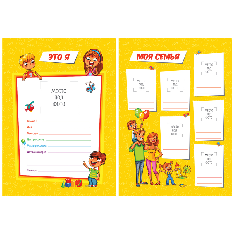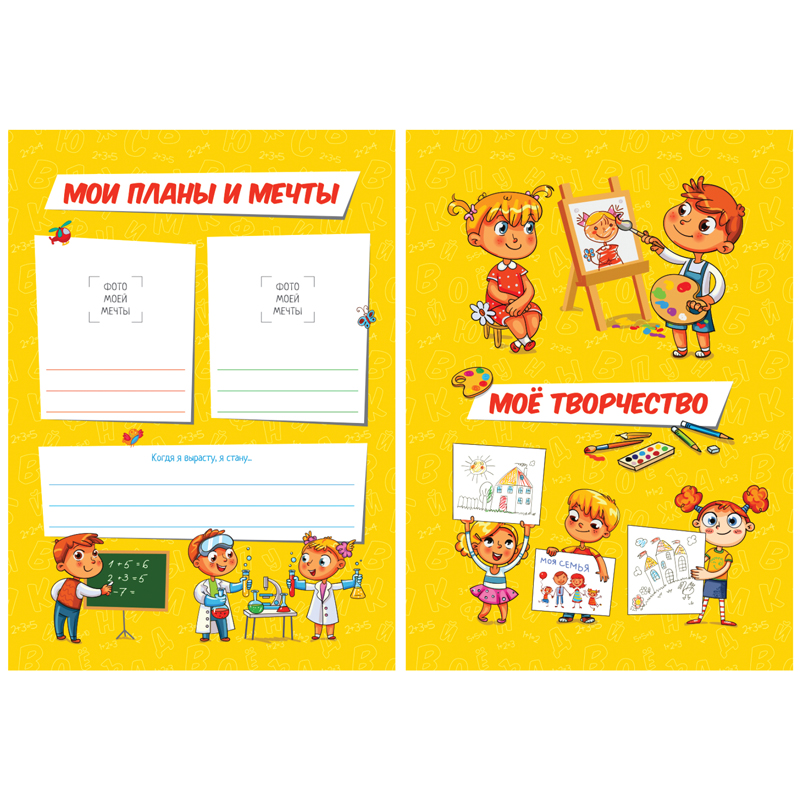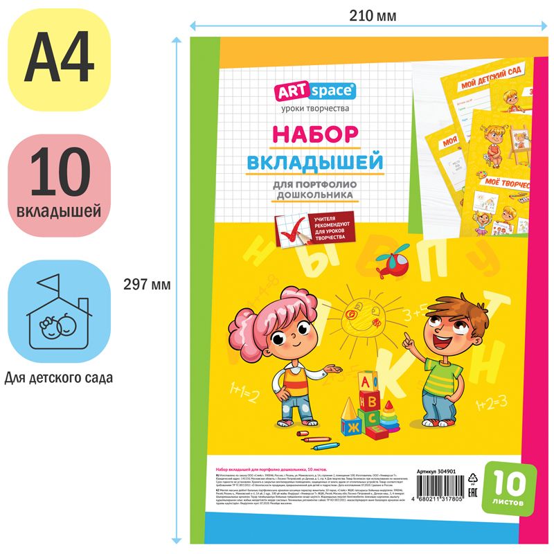 Набор вкладышей ArtSpace А4. Внутри 10 листов для портфолио школьника с разделами: «Это я», «Моя семья», «Мои лучшие друзья», «Мой детский сад», «Моя группа», «Всё, что мне нравится», «Мои планы и мечты», «Моё творчество», «Мои достижения» и «Мои путешествия». Вкладыши изготовлены из плотной мелованной бумаги 115гр/м2.