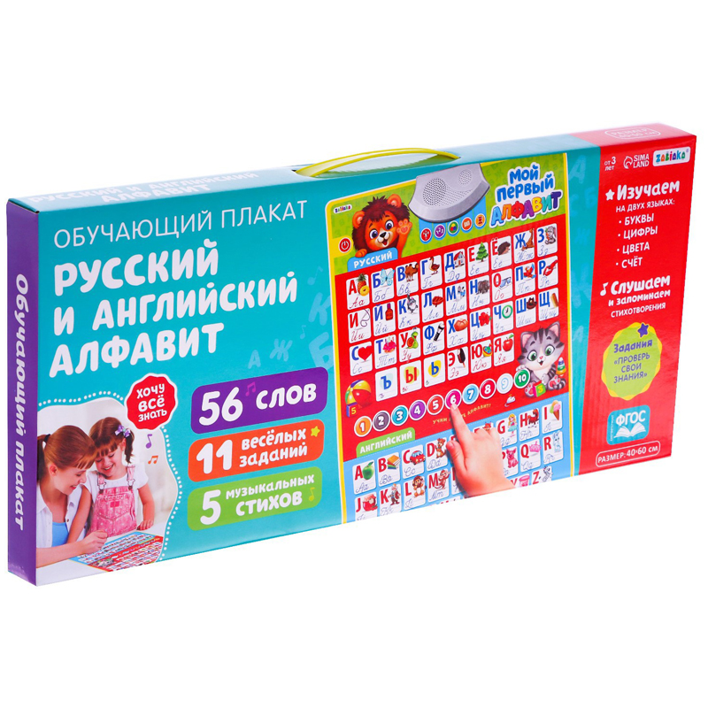 Обучающий плакат «Русский и английский алфавит» позволит ребёнку выучить буквы, цифры и цвета сразу на двух языках.<br/>Умная игрушка поможет развить память, внимательность, усидчивость и интерес ребёнка к учёбе. Яркие картинки сделают процесс обучения веселее.<br/>В режиме «Викторина» ребёнок проверит полученные знания и ответит на вопросы.<br/>С обучающим плакатом ребёнок освоит:<br/>буквы, цифры, цвета, счёт.<br/>Слушайте и запоминайте стихотворения вместе с малышом.<br/>Плакат воспроизводит:<br/>56 слов,<br/>11 заданий,<br/>5 стихов.