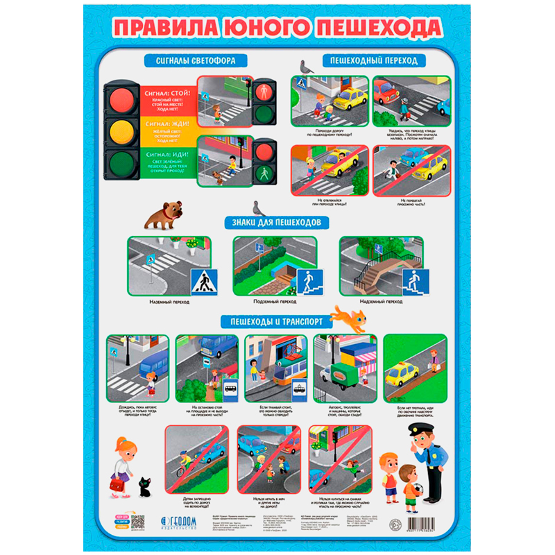Яркие плакаты с забавными и самыми разными животными для изучения букв русского и английского алфавита обязательно понравится малышам. Плакат «Правила юного пешехода» поможет оформить информационный стенд в школе или уголок в детском саду и станет полезным украшением детской комнаты. На плакате отражены важные правила дорожного движения, знания которых очень важны для сохранения здоровья и жизни ребёнка.