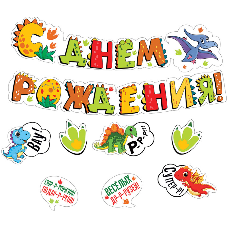 Время топать, танцевать, по-звериному р-р-рычать! День рождения может стать настоящим приключением, если в гости пришли такие обаятельные, весёлые динозаврики! Яркая гирлянда поможет легко и быстро оформить комнату к предстоящему празднику. На её фоне можно сделать замечательные фотографии! А дополнительные детали на скотче с милыми персонажами и пожеланиями будут ещё долго радовать именинника и после праздника! Гирлянда «С днём рождения!» готова к использованию. Крепится к стене или в проёме при помощи булавок, кнопок или скотча. Элементы скреплены между собой мини-люверсами. 7 дополнительных украшений на скотче легко фиксируются на любой гладкой поверхности.