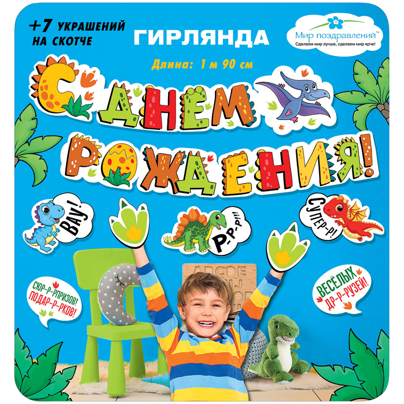 Гирлянда-буквы Мир поздравлений "С днем рождения! Динозавры", 190см, с пикколо
