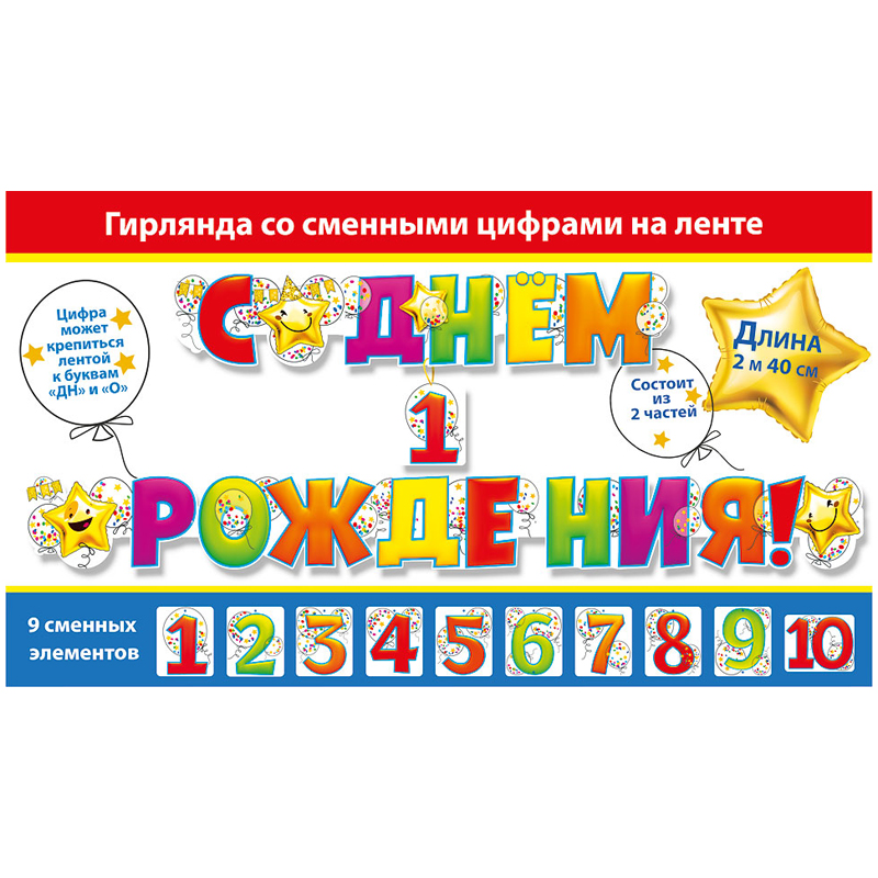 Гирлянда-буквы Мир поздравлений "С днем рождения!", 240см, со сменными цифрами, с пикколо и лентами
