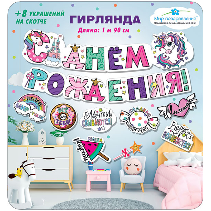 Гирлянда-буквы Мир поздравлений "С днем рождения! Единорожки", 190см, с пикколо