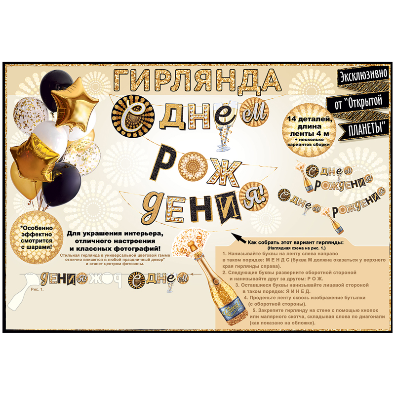 Гирлянда-буквы Открытая планета "С днем рождения! Шампанское", 400см, атласная лента