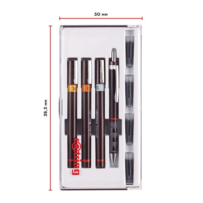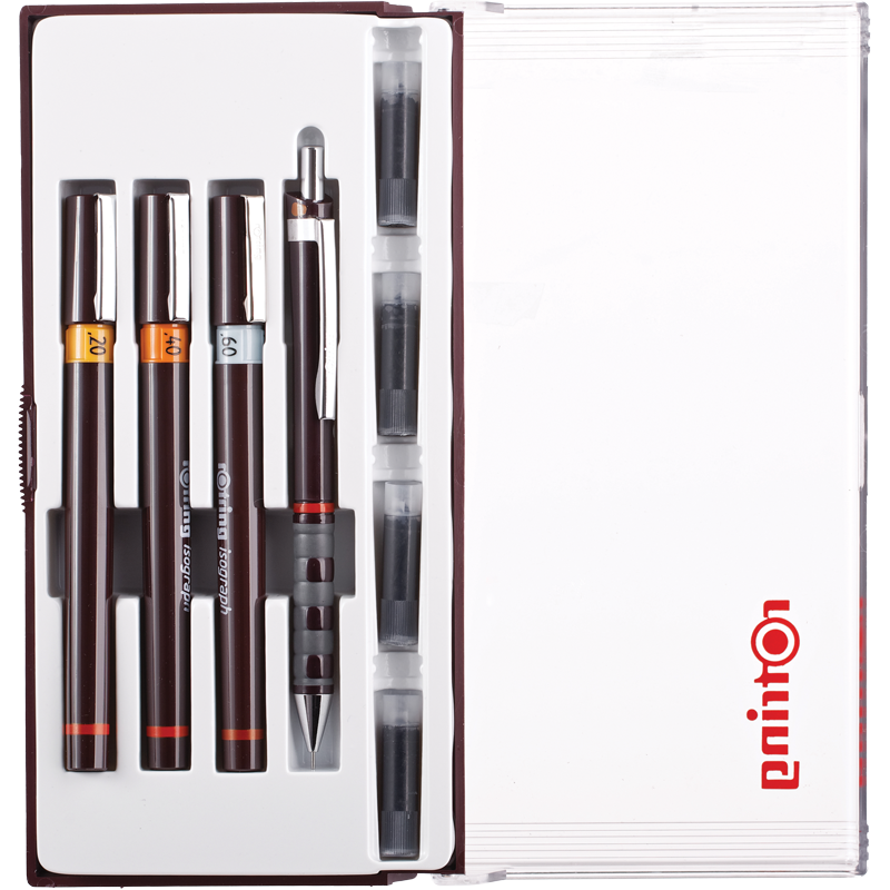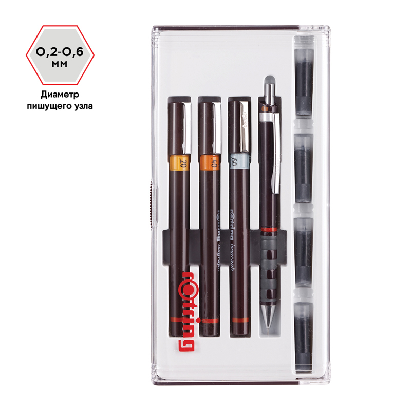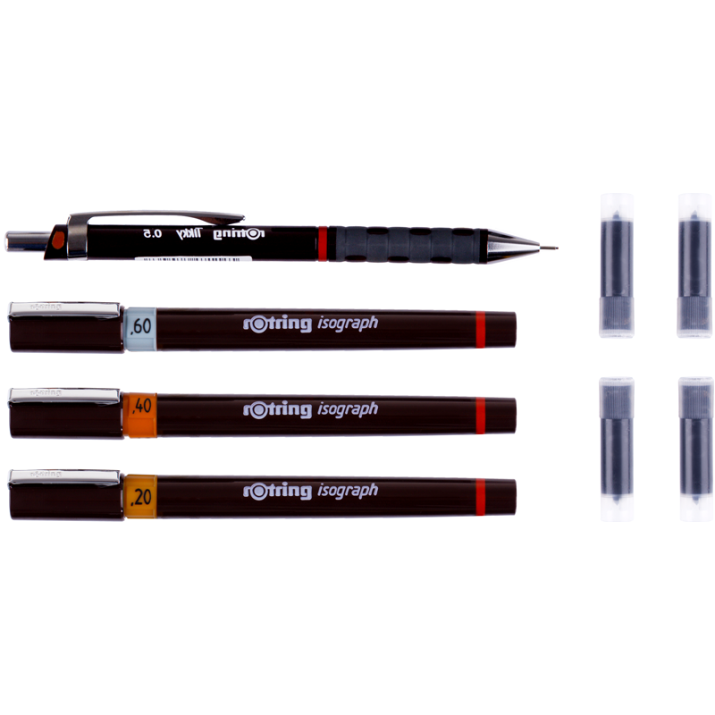 Набор изографов rotring. <br/>В наборе: 3 изографа 0.2, 0.4, 0.6 мм;<br/>механический карандаш Tikky 0.5 мм; <br/>4 картриджа с чернилами.<br/>Набор изографов позволяет использовать одновременно несколько ручек с разными линиями письма.<br/>Механический карандаш Tikky собран из прочного пластикового корпуса с резиновый зоной захвата обеспечивает комфортную работу без устали. Наконечник карандаша оснащён тонкой металлической втулкой для защиты грифеля и удобной работы с линейкой и другими чертёжными инструментами, латунный механизм гарантирует максимально точную подачу грифеля.