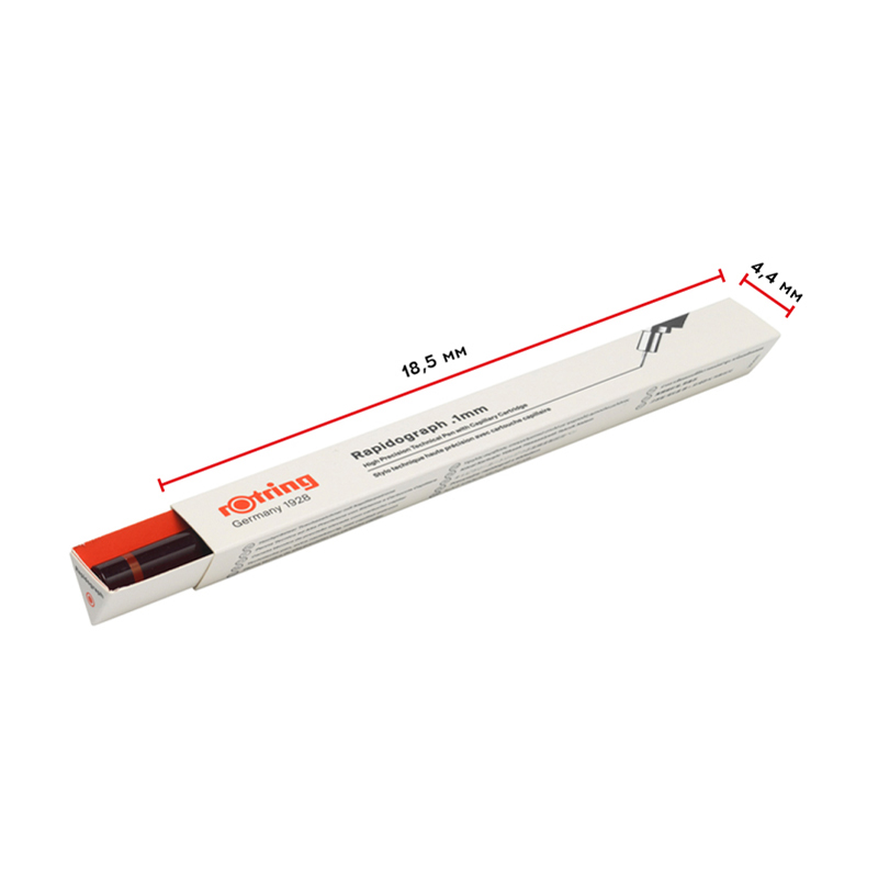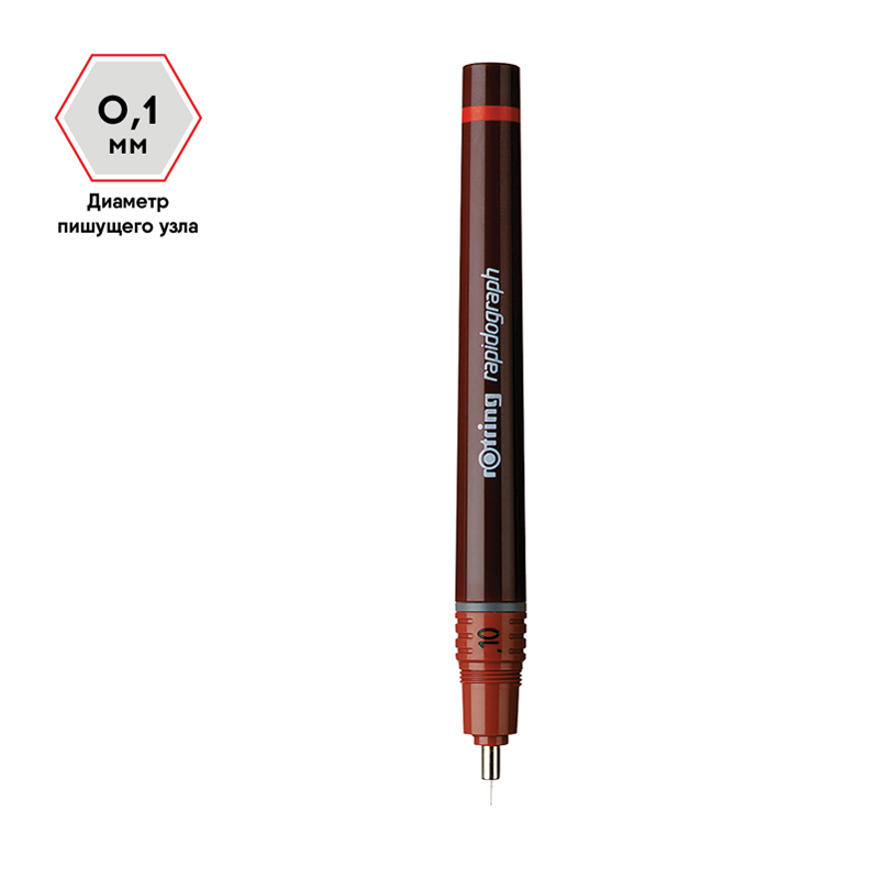 Высокоточная техническая ручка с уникальным капиллярным картриджем от немецкого производителя чертежных принадлежностей и канцелярских товаров rotring. <br/>В линейке рапидографов 13 ручек с различными толщинами пишуших узлов. Толщина наконечника варьируется от 0,1 до 1,0 мм. Различная толщина линии обозначается на корпусе при помощи цветовой маркировки (ISO 9175) или непосредственной надписью в миллиметрах.<br/>- Износостойкий, жесткий хромированный тонкий наконечник позволяет работать c мельчайшими деталями.<br/>- Инновационный картридж, включающий чернильную спираль, поэтому каждый раз, когда он меняется, ручка получает новую чистую спираль и новую систему выравнивания давления для легкого обслуживания.<br/>- Улучшенная температурная стабильность благодаря очень большому объему чернильной спирали и оптимальному расположению вентиляционного отверстия для лучшей надежности.<br/>- Чернила можно использовать до последней капли.<br/>- Уровень чернил хорошо виден.<br/>- Один чернильный картридж входит в комплект ручки.<br/>- Цвет чернил - черный.<br/>- Может использоваться на различных поверхностях, таких как чертежная доска, калька или пергаментная бумага для рисования.<br/>- Упаковка - картонная коробка.