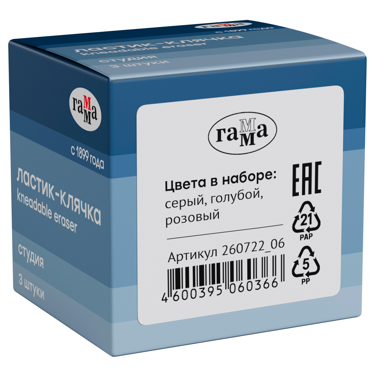 УЦЕНКА - Ластик-клячка Гамма "Студия", 40*35*10мм, серый, голубой, розовый, 3шт, пластик. контейнер, картон. упак.