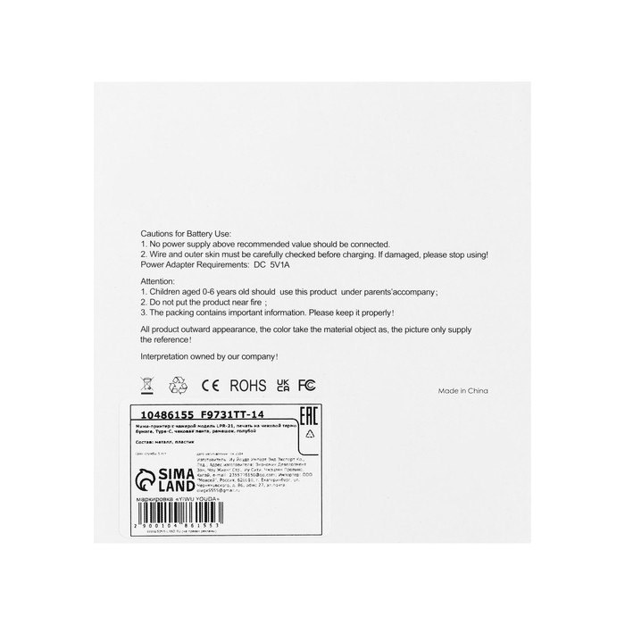 Портативный термопринтер LPR-04, для печати док., стикеров, наклеек, бумага в компл, белый