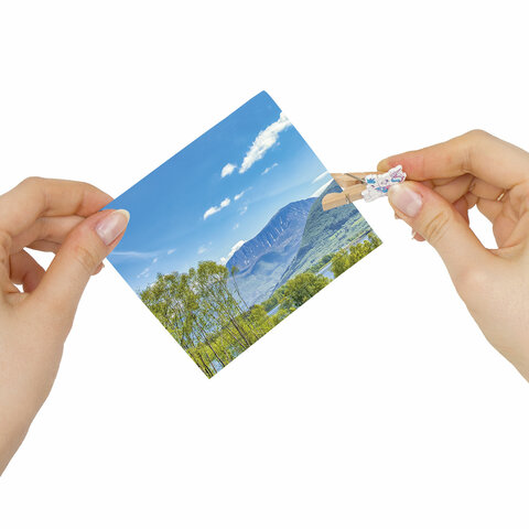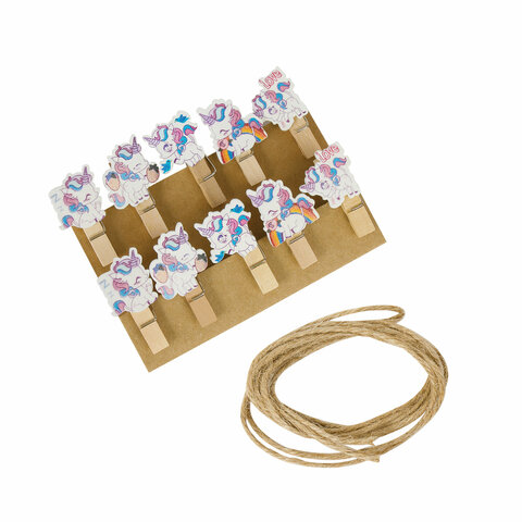 В набор входят 10 деревянных прищепок длиной 3,5 см со шпагатом. Цвет: ассорти, 5 разных дизайнов.