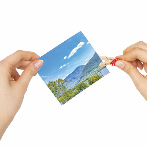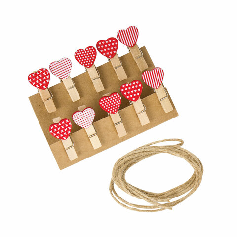 В набор входят 10 деревянных прищепок длиной 3,5 см со шпагатом. Цвет: ассорти, 5 разных дизайнов.