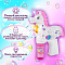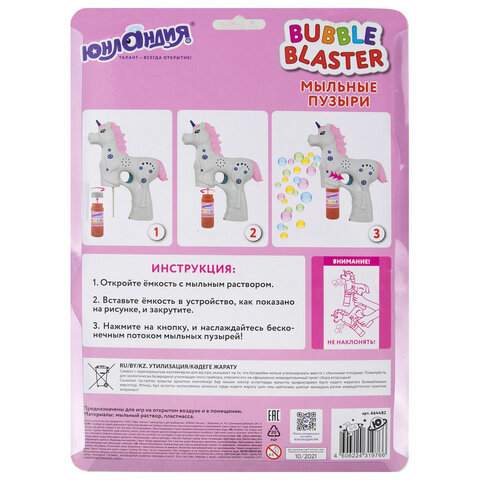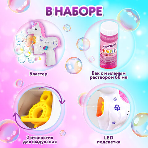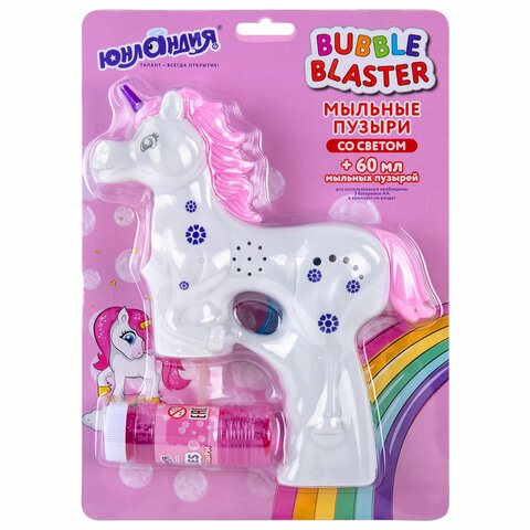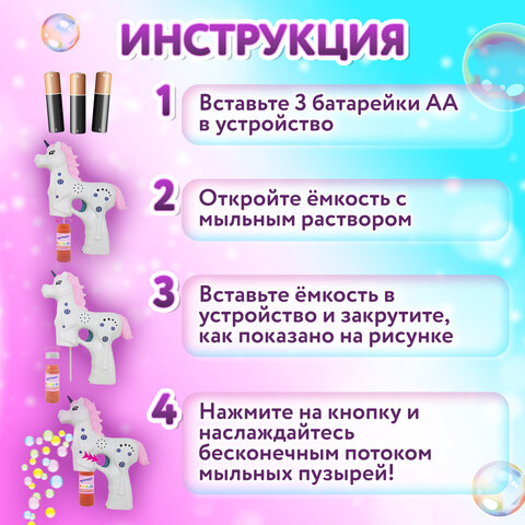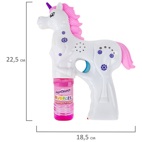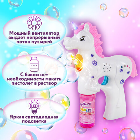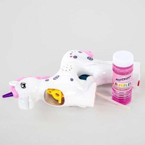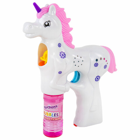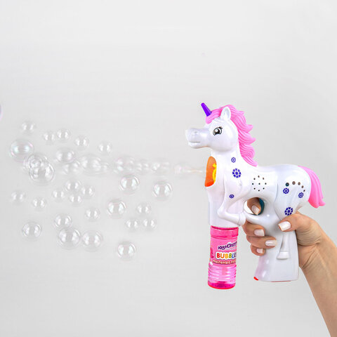 Представляют собой мыльный раствор в декоративной пластиковой баночке объемом 60 мл, к которому прилагается устройство в форме пистолета-единорога для выдувания мыльных пузырей, работающее от 3-х батареек АА. После нажатия на кнопку-курок происходит выдувание целого каскада разноцветных мыльных пузырей. Устройство оснащено подсветкой.