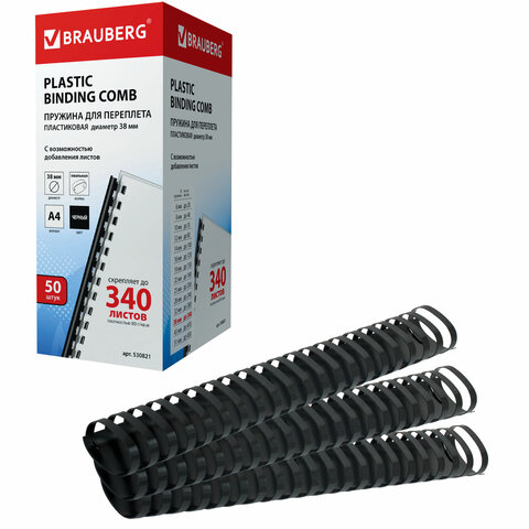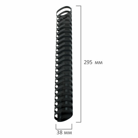 Рекомендуется использовать для переплета документов объемом от 281 до 340 листов. Изготовлена из высококачественного пластика чёрного цвета. Состоит из 21 кольца диаметром 38 мм. В упаковке 50 штук.
