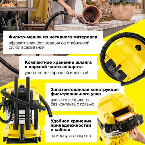 Хозяйственный пылесос KARCHER WD 4 S V-20/5/22 для уборки сухих и влажных загрязнений – энергоэффективная модель многофункционального пылесоса с высокой силой всасывания.