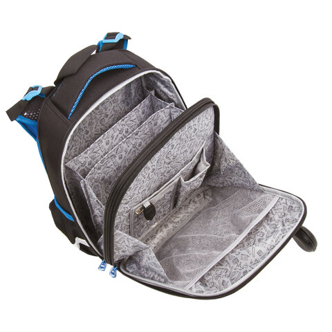В основном отделении ранца можно легко и быстро разместить учебники и тетради между двумя плотными перегородками. Внутри фронтального отделения находится органайзер для канцтоваров, карман для телефона, съёмный карабин для ключей и большое отделение из сетки. Такая организация пространства поможет держать принадлежности в сохранности и приучить ребенка к порядку. Ранец широко раскрывается, повышая удобство использования, а за счёт боковых перегородок содержимое не выскользнет из ранца.