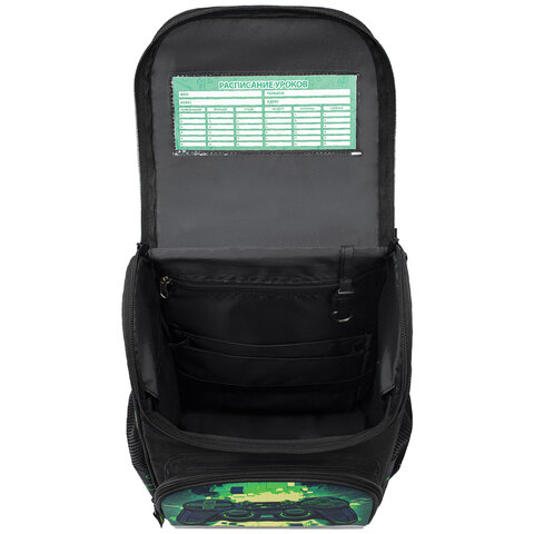 В основном отделении ранца можно легко и быстро разместить учебники и тетради, а также воспользоваться прижимными перегородками на резинке. Внутри ранца имеются карабин для ключей и вкладыш для заполнения расписания уроков на внутренней стенке крышки.