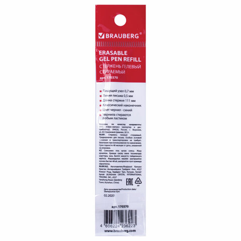Длина стержня 111 мм отлично подходит для стираемых гелевых ручек BRAUBERG "SOFT&SILK" и PILOT "Frixion". При письме и стирании стержень не повреждает бумагу, делая исправления незаметными. Диаметр пишущего узла 0,7 мм создает тонкую линию письма, равную 0,5 мм.