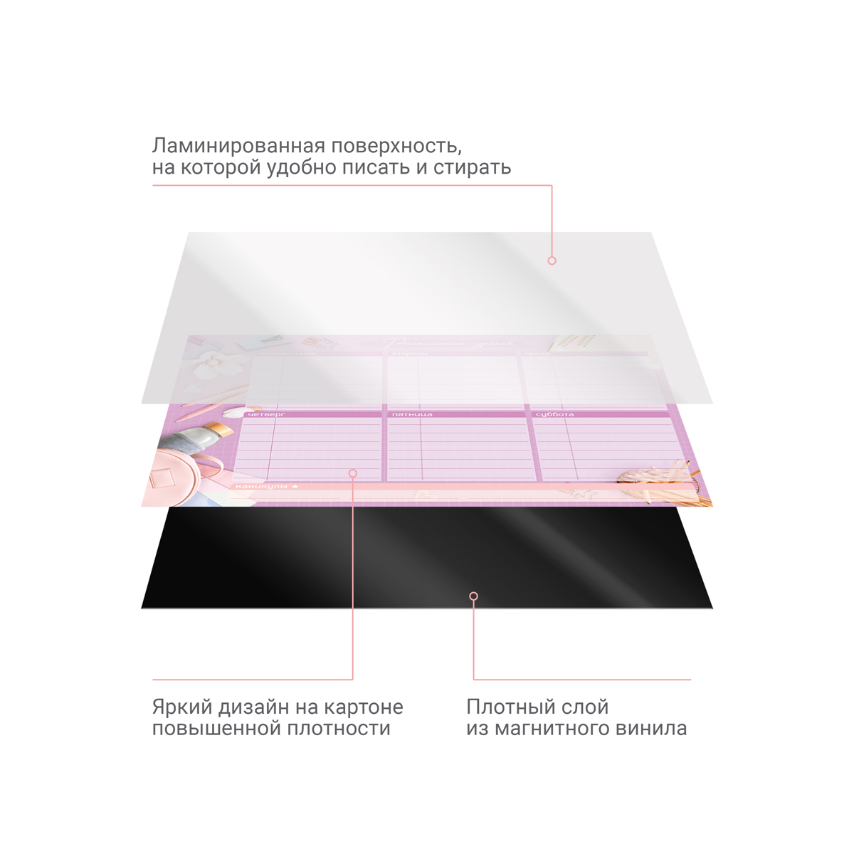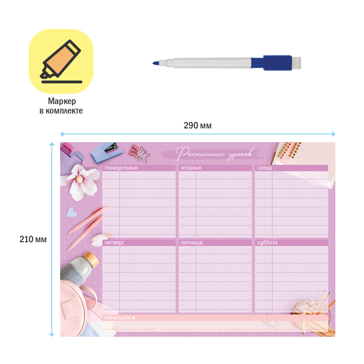 Многоразовый магнитный планер ArtSpace «Пиши-Стирай. Любимый урок» поможет школьнику придерживаться распорядка дня, рационально распределять нагрузку. Изделие формата А4 (210*290 мм) сделано из картона плотностью 200 г/м2 с ламинацией и магнитного винила. Глянцевая поверхность позволяет многократно вносить в расписание изменения при помощи маркера на магните со стирателем, который входит в комплект. Он крепится к любой металлической поверхности, например, к холодильнику. <br/>Расписание рассчитано на шестидневную учебную неделю. Каждый день включает семь уроков. В планере есть специальные блоки для расписания звонков, благодаря которым родители будут в курсе точного времени начала и окончания занятий. Предусмотрен блок с расписанием каникул. Дизайн планера в розовых оттенках понравится девочке. Комплект упакован в индивидуальный пакет с клеевым краем.<br/>• Формат: А4;<br/>• Размер: 210*290 мм;<br/>• Материал: картон, магнитный винил;<br/>• Плотность картона: 200 г/м2;<br/>• Пол: женский.
