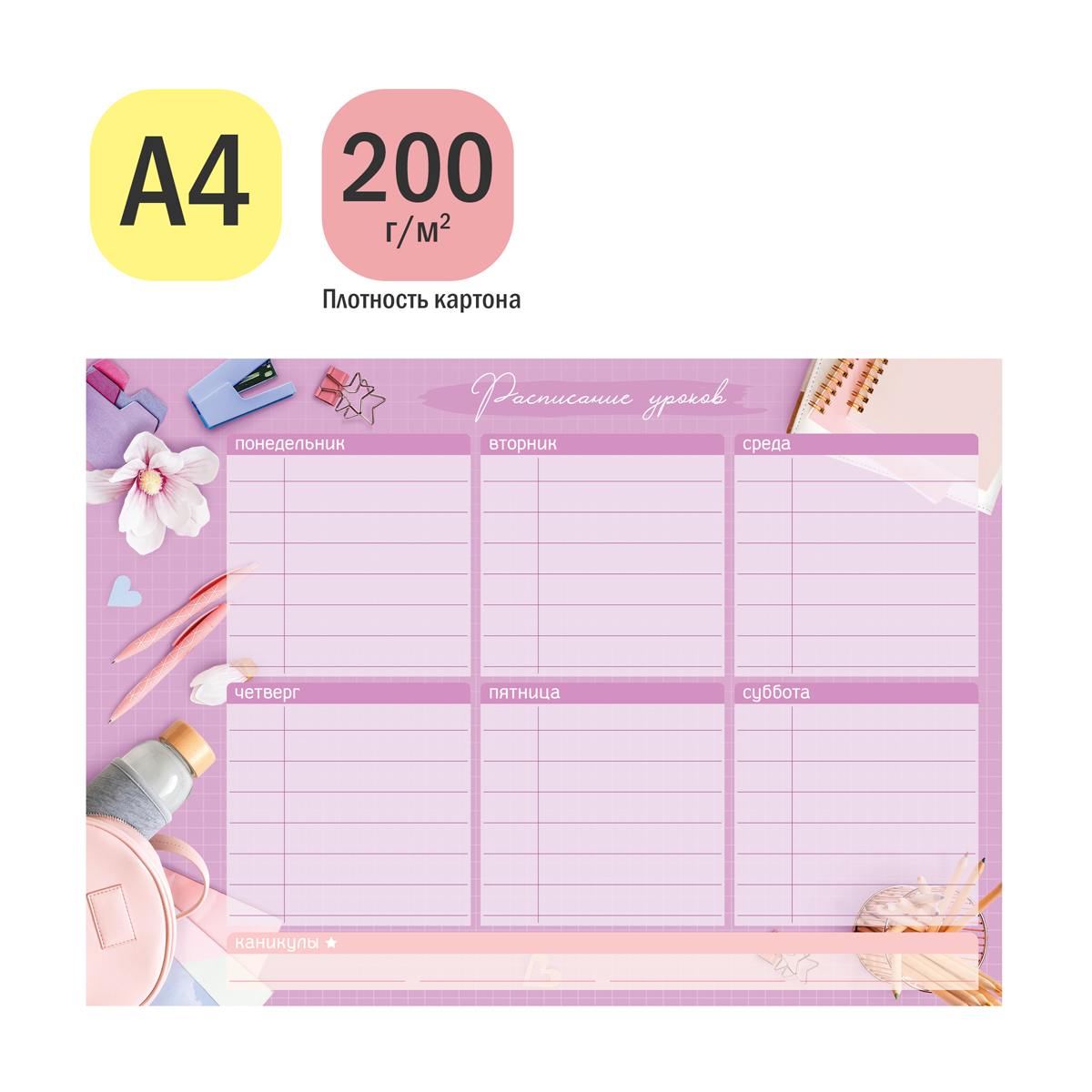 Расписание рассчитано на шестидневную учебную неделю. Каждый день включает семь уроков. В планере есть специальные блоки для расписания звонков, благодаря которым родители будут в курсе точного времени начала и окончания занятий. Предусмотрен блок с расписанием каникул. Дизайн планера в розовых оттенках понравится девочке. Комплект упакован в индивидуальный пакет с клеевым краем.