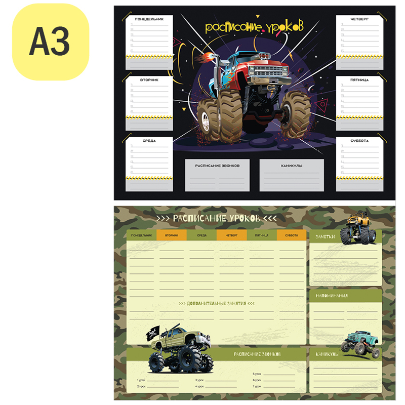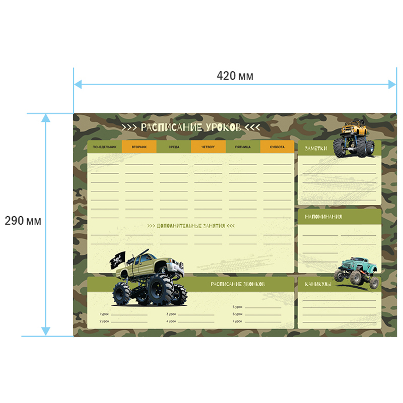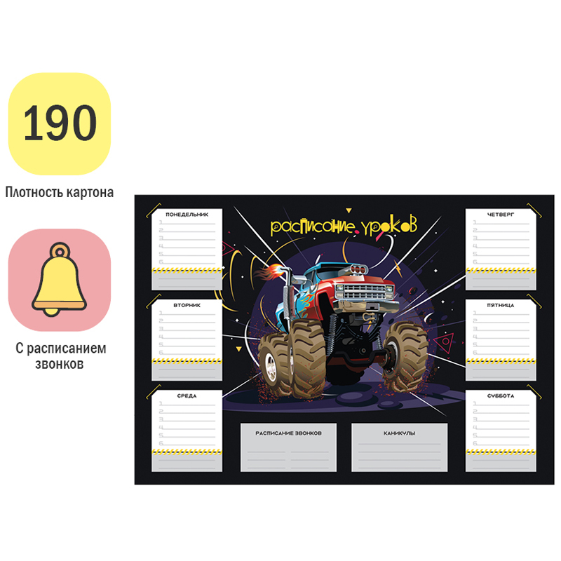 Чтобы правильно составить распорядок дня и рационально распределить время ребенка, необходимо определиться, какие элементы должны быть в нем отражены. Прежде всего это время на учебу в школе и подготовку домашнего задания в домашних условиях. В вопросе школьного планирования идеально подходит расписание уроков ArtSpace. Включает блок "Расписание звонков".<br/>Выполнено из плотного картона 190 г/м2<br/>Ассорти из 2 дизайнов (10+10).<br/>Транспортная упаковка: гофрокороб или крафт бумага по 400шт.