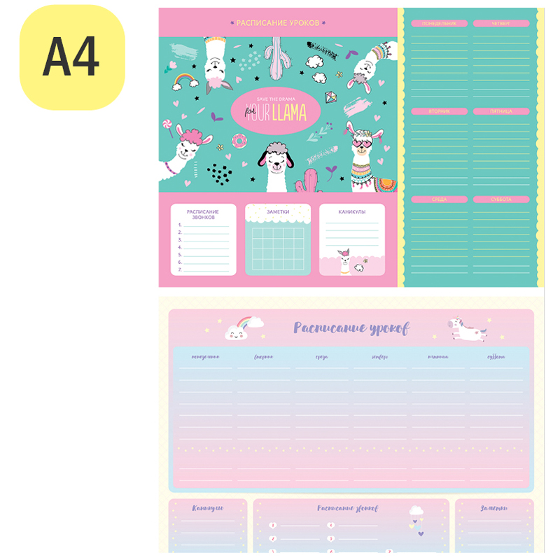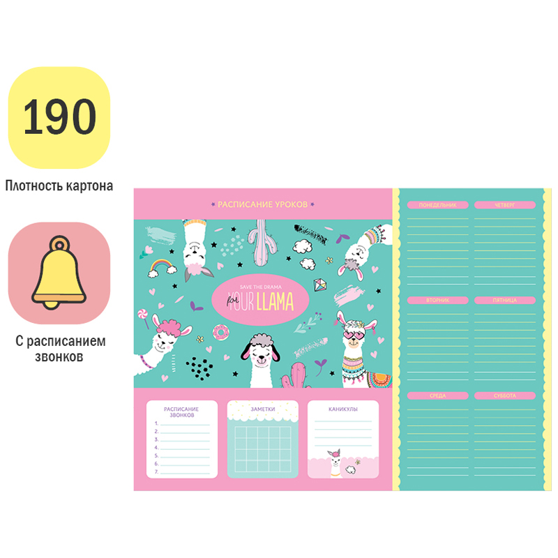 Чтобы правильно составить распорядок дня и рационально распределить время ребенка, необходимо определиться, какие элементы должны быть в нем отражены. Прежде всего это время на учебу в школе и подготовку домашнего задания в домашних условиях. В вопросе школьного планирования идеально подходит расписание уроков ArtSpace. Включает блок "Расписание звонков".<br/>Выполнено из плотного картона 190 г/м2<br/>Ассорти из 2 дизайнов (10+10).<br/>Транспортная упаковка: гофрокороб или крафт бумага по 600шт.