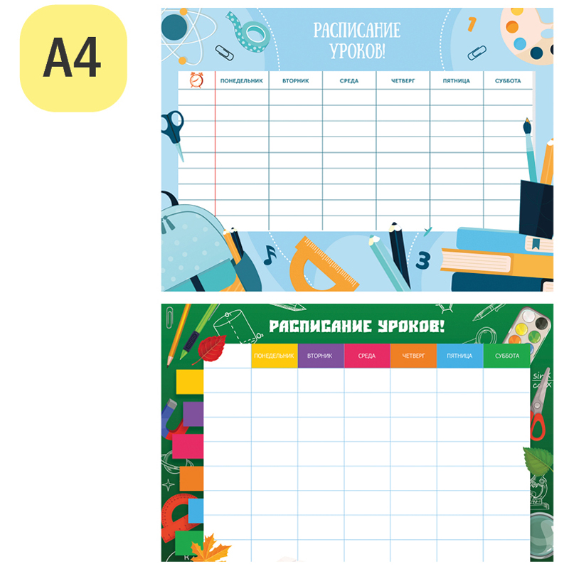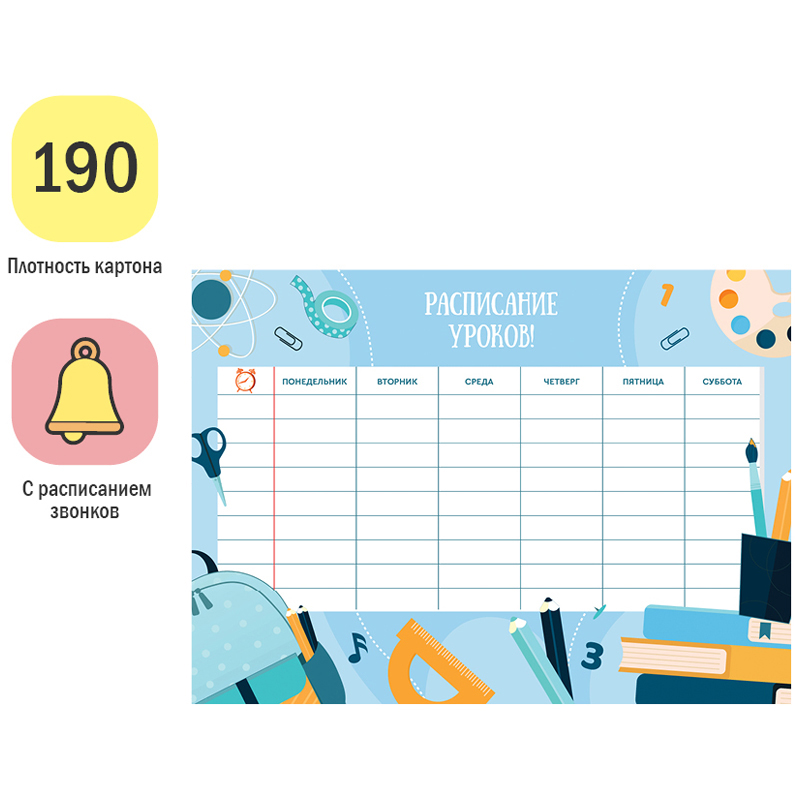 Чтобы правильно составить распорядок дня и рационально распределить время ребенка, необходимо определиться, какие элементы должны быть в нем отражены. Прежде всего это время на учебу в школе и подготовку домашнего задания в домашних условиях. В вопросе школьного планирования идеально подходит многоразовое расписание уроков ArtSpace "Пиши-стирай".<br/>Для письма рекомендуем маркеры или фломастеры на водной основе (в набор не входят). Ламинированная поверхность позволяет вносить изменения и правки.<br/>Включает блок "Расписание звонков".<br/>Выполнено из плотного картона 190 г/м2 с глянцевой ламинацией.<br/>Ассорти из 2 дизайнов (10+10).<br/>Транспортная упаковка: гофрокороб или крафт бумага по 600шт.