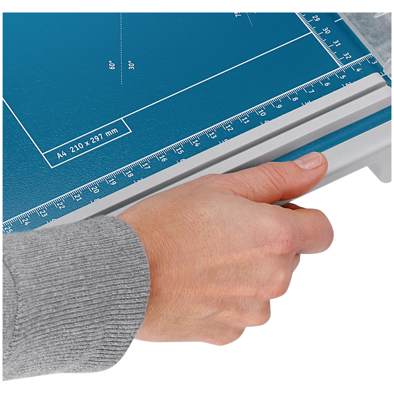 • Форматные линии на столе с мм-шкалой вдоль режущей кромки облегчают выравнивание материала