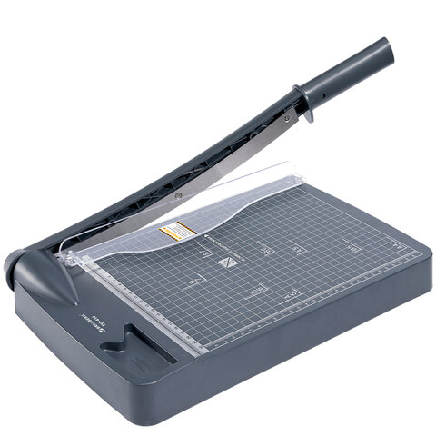 Оснащен безопасным лезвием и прижимом для бумаг. Рукоятка анатомической формы препятствует соскальзыванию руки, а специальное крепление для рукояти зафиксирует её в закрытом положении и предотвратит непреднамеренное поднятие. В резак встроен возвратный механизм, который автоматически поднимает лезвие вверх, что значительно экономит силы при длительном использовании. В корпус встроен лоток-органайзер для скрепок или иных канцелярских принадлежностей. Удобная разметка рабочей поверхности позволяет точно наметить линию реза. Длина реза составляет 300 мм. Также имеются уголки для форматов А4, B5, А5, B6, B7. Резиновые ножки вкупе с прочным основанием предотвращают скольжение по рабочему столу во время эксплуатации. Размер - 72х262х498 мм. Малый вес (0.99 кг.) делает его одним из самых легких резаков на рынке.