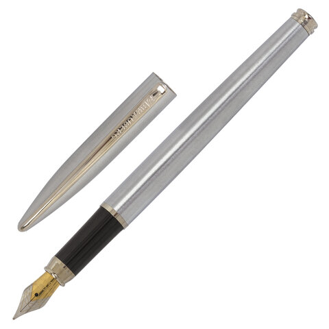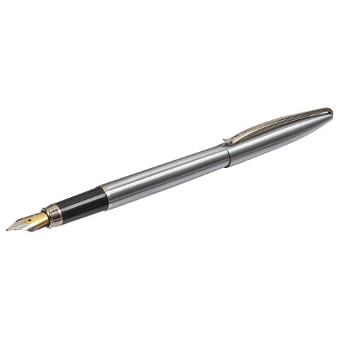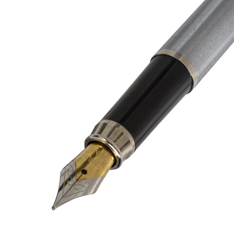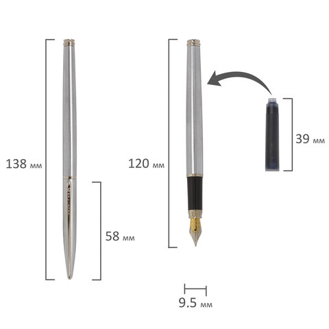 Стильная модель перьевой ручки с корпусом из металла серебристого цвета и хромированными деталями. Синий цвет чернил, иридиевое перо украшено гравировкой. Диаметр пишущего узла 0,5 мм создает ровню линию письма. Тип пера M (Medium) – средняя ширина линии. Размер картриджа – 39 мм.