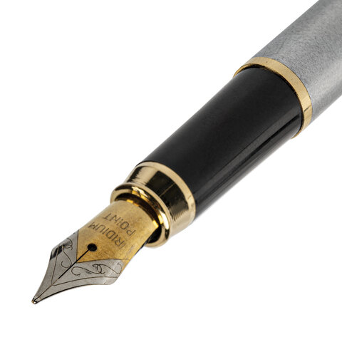 Стильная модель перьевой ручки с корпусом из металла серебристого цвета и золотистыми деталями. Синий цвет чернил, иридиевое перо украшено гравировкой. Диаметр пишущего узла 0,5 мм. Тип пера M (Medium) – средняя ширина линии. Размер картриджа – 39 мм.