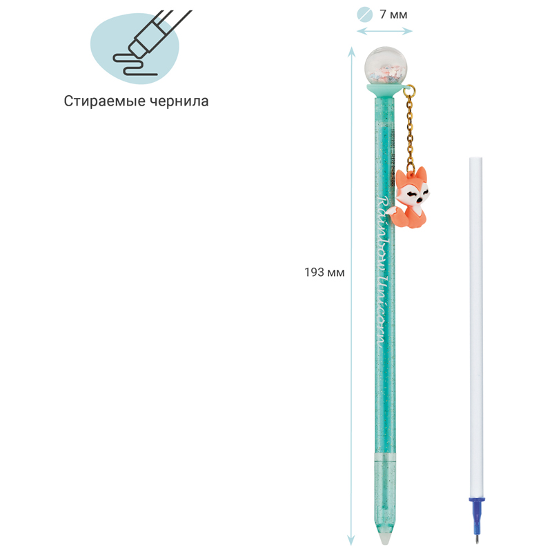 Гелевая стираемая ручка Meshu Glitter Ball станет ярким атрибутом отличного настроения на работе или учёбе. Изделие обладает необычным дизайном: ручка украшена шаром с блестками внутри и мини-брелоком с игрушечным зверьком. Гелевые чернила не только ярко пишут на бумаге, но и при воздействии температуры становятся невидимыми – достаточно потереть написанное ластиком на кончике ручки. Обесцвеченные чернила проявляются при низкой температуре. Диаметр пишущего узла составляет 0,5 мм, благодаря чему ручка прекрасно подойдёт для любого стиля письма. Толщина линии составляет 0,3 мм. Благодаря чернилам синего цвета ручку можно использовать в работе или учёбе на постоянной основе. Чернила сменные, что говорит о долговечности изделия.