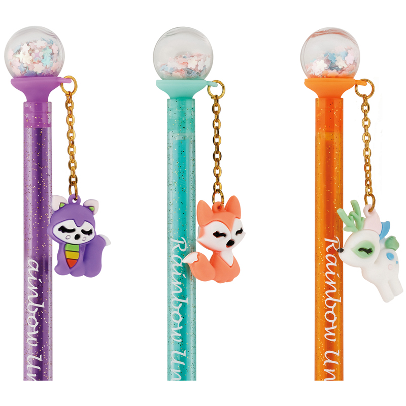 Гелевая стираемая ручка Meshu Glitter Ball станет ярким атрибутом отличного настроения на работе или учёбе. Изделие обладает необычным дизайном: ручка украшена шаром с блестками внутри и мини-брелоком с игрушечным зверьком. Гелевые чернила не только ярко пишут на бумаге, но и при воздействии температуры становятся невидимыми – достаточно потереть написанное ластиком на кончике ручки. Обесцвеченные чернила проявляются при низкой температуре. Диаметр пишущего узла составляет 0,5 мм, благодаря чему ручка прекрасно подойдёт для любого стиля письма. Толщина линии составляет 0,3 мм. Благодаря чернилам синего цвета ручку можно использовать в работе или учёбе на постоянной основе. Чернила сменные, что говорит о долговечности изделия.<br/>• Цвет чернил: синий;<br/>• Толщина линии письма: 0,3 мм;<br/>• Цвет корпуса: ассорти;<br/>• Количество штук в упаковке: 36.