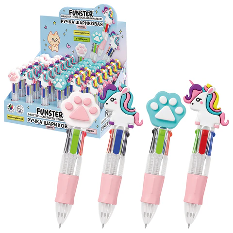 Ручка мини многоцветная шариковая автоматическая FUNSTER "MIX" предназначена специально для маленьких учеников. Укороченный размер и прорезиненная зона захвата обеспечивает комфортное положение в руке при письме, минимизируя нагрузку и позволяя писать особенно долго. Ручка имеет прозрачный корпус и дополнена очаровательными топперами ассорти: обаятельные единороги и милые лапки голубого и белого цвета. Ручка оснащена четырьмя стержнями универсальных цветов: синий, красный, зеленый и черный - идеально для ведения записей и выделения важных заметок. Стержни имеют стандартный наконечник диаметром 0,7 мм, толщина линии письма - 0,35 мм.