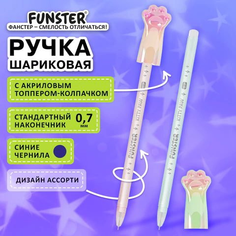 Ручка с акриловым топпером шариковая FUNSTER "KITTY PAW" - это не только надежный инструмент для письма, но и очаровательный аксессуар, который станет украшением любого рабочего пространства. Ручка, которая не просто пишет, а вдохновляет!