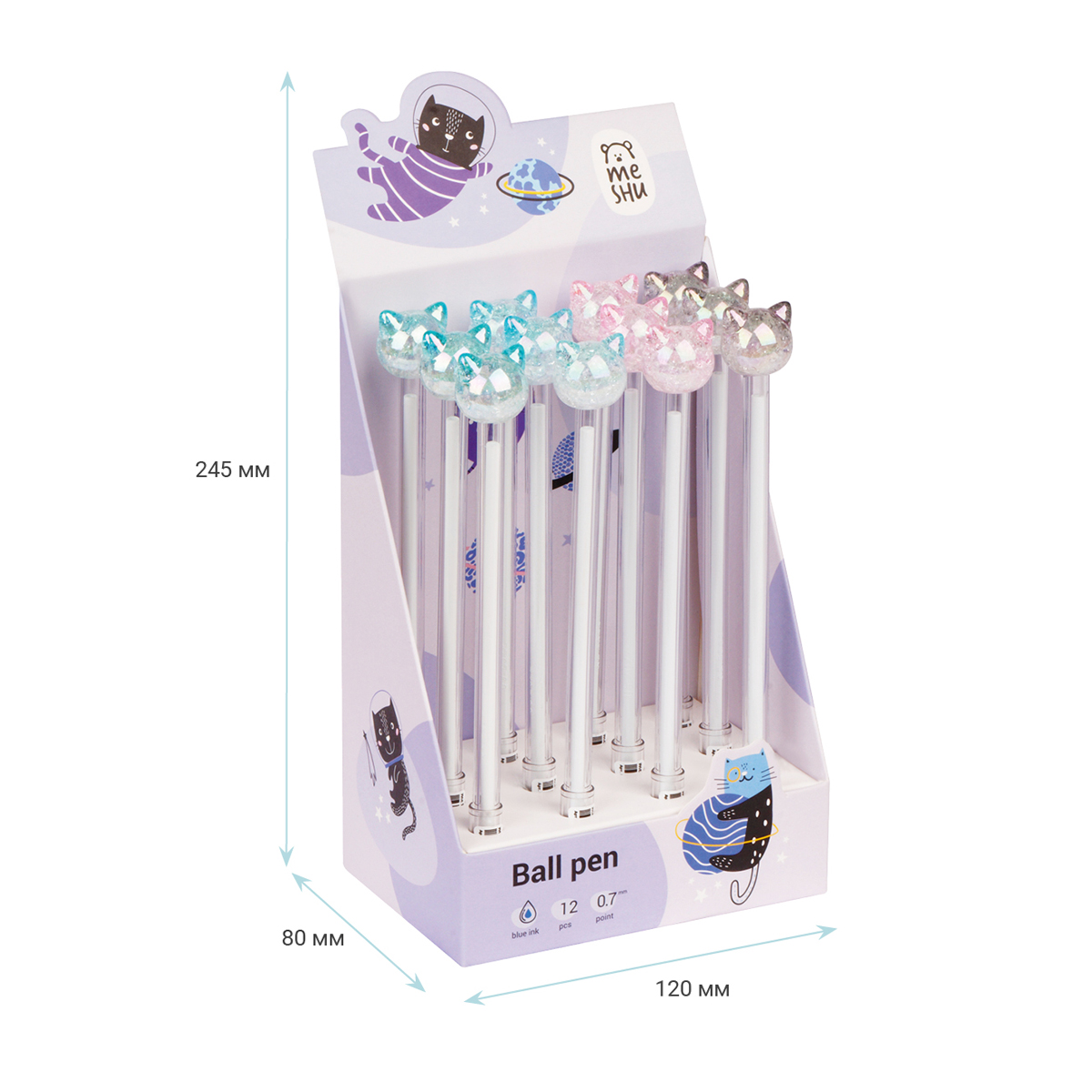 Шариковая ручка MESHU Crystal Kitten станет атрибутом отличного настроения на работе или учёбе. Диаметр пишущего узла – 0,7 мм. Ручка прекрасно подойдёт для мягкого и быстрого письма. Толщина линии письма – 0, 5 мм, а длина письма может достигать от 450 до 500 метров. Ручка обладает необычным дизайном: круглый корпус белого цвета дополняет милая игрушка-кристальный котик. У ручки есть пластиковый колпачок, который гарантирует, что изделие не повредится в сумке и не оставит следов на посторонних предметах. Благодаря чернилам синего цвета ручку можно ежедневно использовать в работе или учёбе. Изделие предусматривает возможность замены стержня длиной 126 мм. Ручки упакованы в картонную коробку-дисплей.<br/>• Цвет: синий;<br/>• Длина сменного стержня: 126 мм;<br/>• Диаметр пишущего узла: 0,7 мм;<br/>• Форма корпуса: круглая;<br/>• Топпер: котик;<br/>• Длина ручки с колпачком: 19 см.