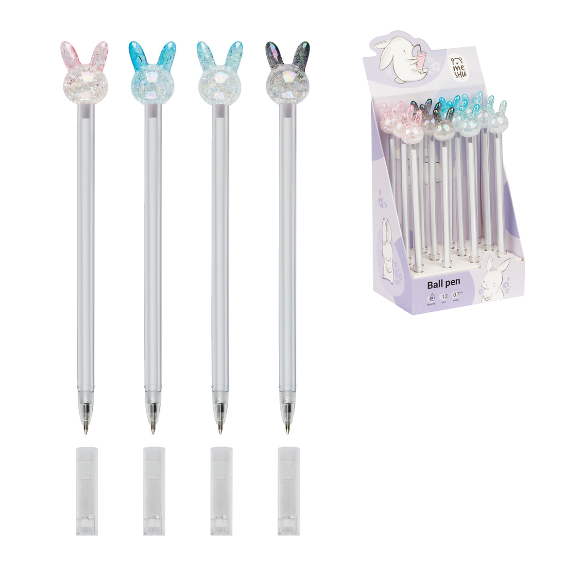 Шариковая ручка MESHU Crystal Rabbit станет атрибутом отличного настроения на работе или учёбе. Диаметр пишущего узла – 0,7 мм. Ручка прекрасно подойдёт для мягкого и быстрого письма. Толщина линии письма – 0, 5 мм, а длина письма может достигать от 450 до 500 метров. Ручка обладает необычным дизайном: круглый корпус белого цвета дополняет милая игрушка-кристальный зайчик. У ручки есть пластиковый колпачок, который гарантирует, что изделие не повредится в сумке и не оставит следов на посторонних предметах. Благодаря чернилам синего цвета ручку можно ежедневно использовать в работе или учёбе. Изделие предусматривает возможность замены стержня длиной 126 мм. Ручки упакованы в картонную коробку-дисплей.<br/>• Цвет: синий;<br/>• Длина сменного стержня: 126 мм;<br/>• Диаметр пишущего узла: 0,7 мм;<br/>• Форма корпуса: круглая;<br/>• Топпер: заяц;<br/>• Длина ручки с колпачком: 19 см.
