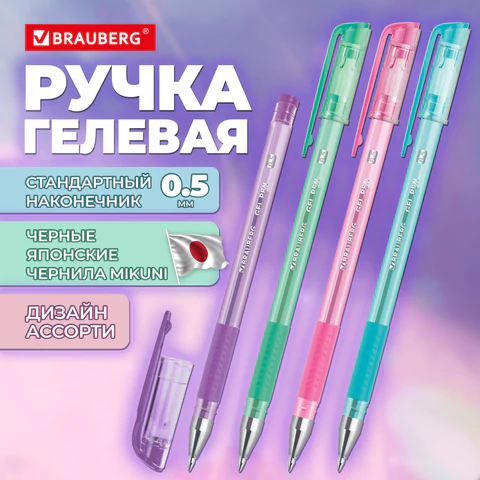 Ручка гелевая с грипом BRAUBERG "VIVID PASTEL", СИНЯЯ, корпус ассорти, игольчатый узел 0,5 мм, линия письма 0,35 мм, 144539