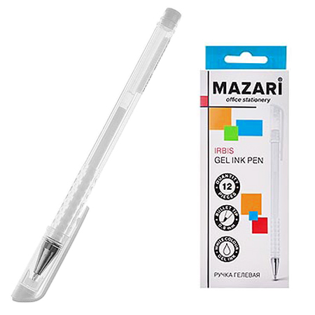 Ручка гелевая " Mazari " Irbis белая 0,8мм рифленый держатель, металлизированный наконечник, стержень 130мм, полупрозрачный пластиковый корпус, картонная упаковка