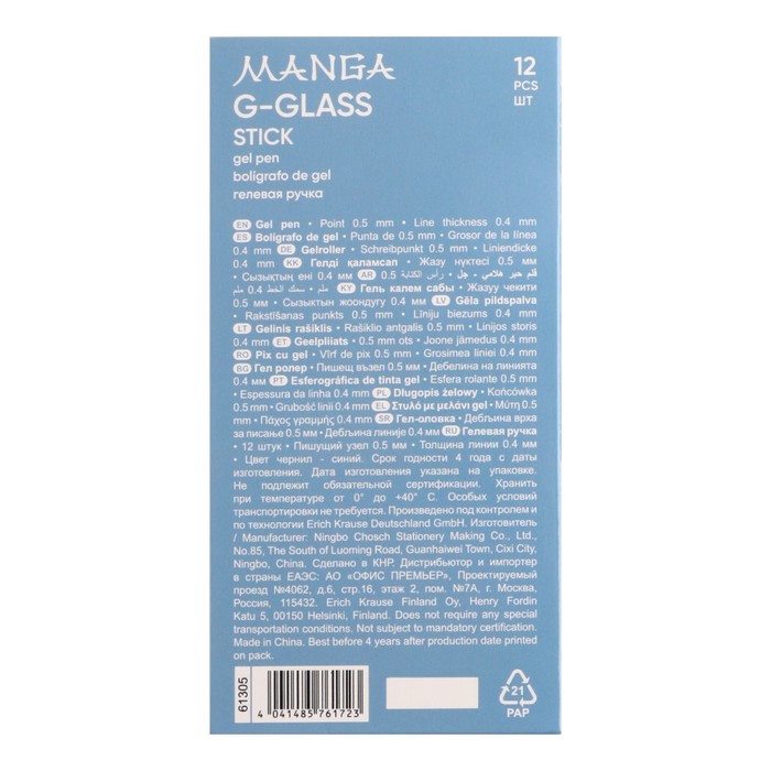 Ручка гелевая ErichKrause G-Glass Stick Manga, игольчатый узел 0.5 мм, чернила синие, увеличенный запас чернил, МИКС