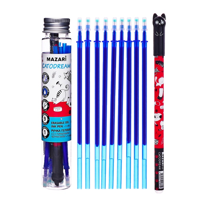 Ручка гелевая синяя со стираемыми чернилами Mazari "CATODREAM" + 9 стержней в комплекте, игольчатый пишущий узел 0,5 мм, термочувствительные чернила МИКС