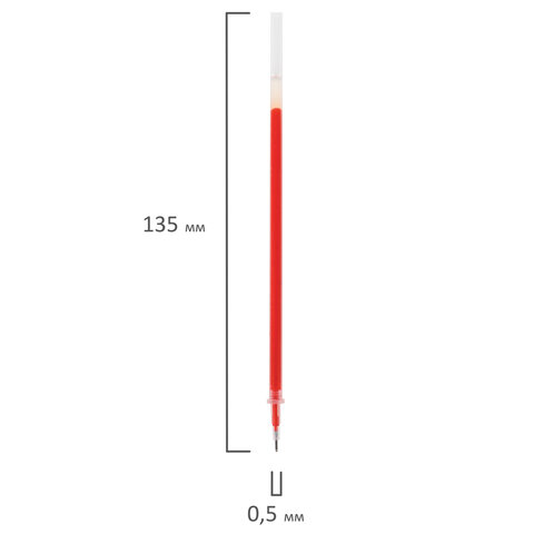 Длина стержня составляет 135 мм. Диаметр пишущего узла 0,5 мм создает тонкую линию письма, равную 0,35 мм. Имеет игольчатый наконечник. Цвет чернил - красный.