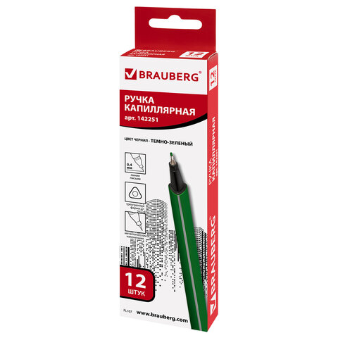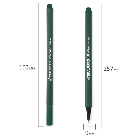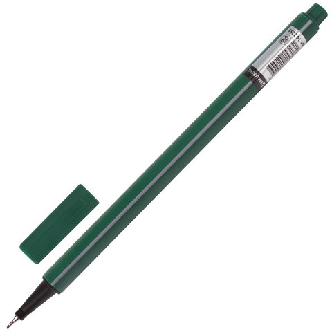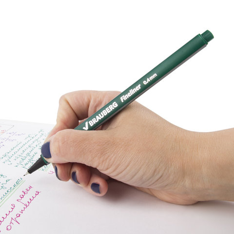 Ручка капилярная темно-зеленого цвета имеет трехгранную форму корпуса, диаметр которого 9 мм. Благодаря такой форме корпуса изделие удобно располагать в руке. Супертонкий износостойкий металлический наконечник 0,4 мм идеально подходит для создания точных и аккуратных линий. Цвет корпуса и колпачка соответствует цвету темно-зеленых чернил.